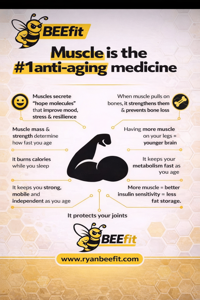 Aging is determined by lifestyle, not genetics…Muscle Mass & Strength are the top predictors of health and longevity.